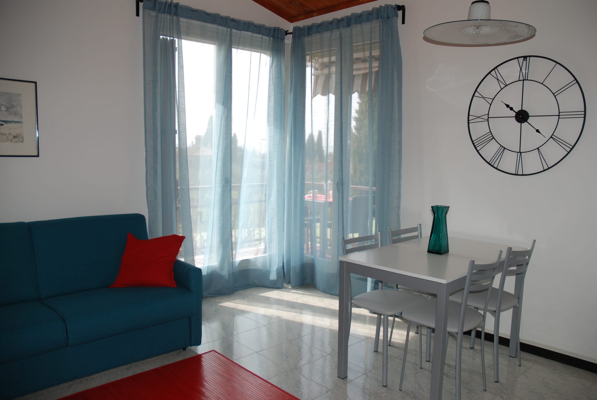 L'appartamento è composto da cucina, soggiorno con terrazza, camera da letto e un bagno. La cucina è completa di tutti i comfort: stoviglie, frigorifero, macchina caffè, microonde e lavatrice. Comodo soggiorno con divano letto, TV. Bagno con doccia. Ampia terrazza vista lago con tavolo per colazione e pranzo. Piscina condominiale con sdrai a disposizione. Wi-Fi gratuito